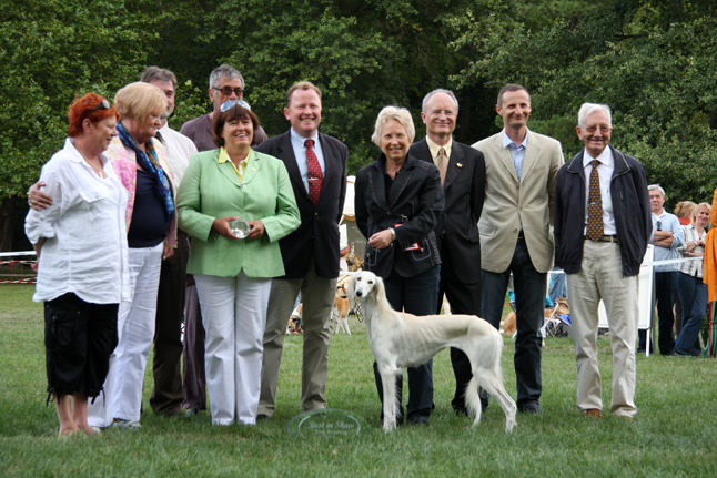 Sieger-Foto mit CH Dakira Sawahin und dem internationalen Richtergremium: Einen Bericht zur Saluki-Jahresausstellung finden Sie auf der Website des DWZRV | |||||||||||