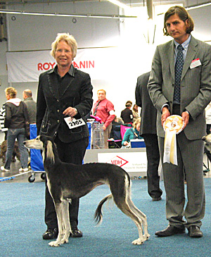 | Dakira wurde in 2009 nur bei der Saluki-Jahresausstellung ausgestellt, an der 137 Salukis teilnahmen. Sie wurde Saluki-Jahressiegerin 2009, Bester der Rasse (BOB) und zum besten Hund der gesamten Ausstellung gekürt (Best-in-Show). | |||||||||||