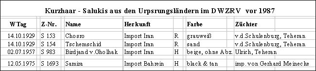 Der Kurzhaar-Saluki - Fakten und Erkenntnisse [Artikel als PDF-Datei mit Fotos] I.Teil: Fakten 1. In allen Standards dieser Welt sind seit jeher Kurzhaar-Salukis zugelassen. Was viele Windhund-Freunde nicht wissen, manche Saluki-Besitzer sich nur schwer vorstellen können und einige einfach nicht akzeptieren wollen, ist die Tatsache, daß in allen Saluki-Standards, ob noch gültig oder längst außer Kraft gesetzt, von der FCI oder dem AKC (American Kennel Club) abgesegnet oder ob vom Patronatsland (Großbritannien) erlassen, der Kurzhaar-Saluki immer ausdrücklich als zugelassene Varietät genannt und beschrieben wird. Die Zucht von Kurzhaar-Salukis ist daher kein modischer Trend, wie fälschlicherweise manche infolge Unkenntnis der historischen Zusammenhänge meinen. Als Belege seien drei Standards zitiert: Im allerersten Rassestandard für Salukis, der in England 1923 von den Gründungsmitgliedern des Saluki or Gazelle Hound Club formuliert wurde und nach dem noch heute in den USA gerichtet wird, heißt es: „Smooth variety: In this variety the points should be the same (Anmerkung des Autors: wie bei den Befederten) with the exception of the coat, which has no feathering.“ Im bis vor einigen Jahren gültigen Saluki-Standard der FCI Nr.269a vom 28.12.71 steht unter dem Stichwort Haarkleid: „Außerdem gibt es völlig glatthaarige Salukis, denen jede Befederung oder wollige Behaarung fehlt. Für sie gilt im übrigen der gleiche Standard.“ Der seit 28.3.1994 innerhalb der FCI gültige Standard (FCI-Nr.269 D) faßt sich noch kürzer: „Die kurzhaarige Varietät entspricht dem vorstehenden Text, mit Ausnahme der Befederung.“ Diese völlig glatthaarigen Salukis, allgemein im deutschsprachigen Raum als Kurzhaar-Salukis genannt, werden in der englischsprachigen Literatur als Smooths bezeichnet. Die Fakten des Standards nicht anzuerkennen, heißt, gegen den wichtigsten Punkt der Zuchtordnung zu verstoßen, in dem steht, daß das Zuchtziel durch die Rassekennzeichen (Standards der FCI) festgelegt ist. Nicht alle Saluki-Freunde werden bisher die Gelegenheit gehabt haben, einen Kurzhaar-Saluki zu sehen. Wie der Standard es vorschreibt, sieht er in allen anatomischen Einzelheiten genauso aus wie ein befederter Saluki, und es gibt ihn auch in ebenso vielen verschiedenen Typen. Lediglich fehlt ihm jede Befederung an den Ohren, der Rute und an den Läufen. Das Fehlen der Befederung an allen genannten Körperteilen ist das Charakteristikum, das den Kurzhaar-Saluki ausmacht. Die Betonung liegt hierbei auf allen. Es soll damit deutlich gemacht werden, ein Kurzhaar-Saluki ist phänotypisch als auch genotypisch etwas völlig anderes als ein Saluki mit schwacher oder kaum Befederung. Letzteres ist nichts anderes als ein wenig befederter Saluki - jedoch kein Kurzhaar-Saluki. Ein befederter Saluki erfüllt zwar den Standard, "wenn seidiges Haar nur auf der oberen Hälfte des Ohres wächst. Längeres Haar ist ebenfalls korrekt." Dennoch wird im allgemeinen bei einem erwachsenen Saluki eine Befederung, die nur die obere Hälfte des Ohrs bedeckt, als schlechte Befederung bewertet. Ähnliches gilt für die Länge der Befederung der Rute. Die Bewertung der Befederung erfolgt auf Ausstellungen meist nach dem Prinzip je mehr - desto besser. Die Einstellung bei vielen, daß ein Saluki erst dann besonders schön und Saluki-typisch ist, wenn er lange Befederung an den Ohren und an der Rute hat, ist gewiß mit ein Grund dafür, daß es auf dem europäischen Festland bisher nur wenig Freunde für den Kurzhaar-Saluki gibt. Wer das orientalische Gepräge und gleichzeitig das kurzhaarige Fell beim Windhund liebte, fand ab 1970 in Deutschland und den angrenzenden Staaten mangels der Kenntnisse über die Existenz von Kurzhaar-Salukis, des Vorhandenseins entsprechender Hunde und Züchter seine kynologische Heimat sehr schnell bei den Sloughis oder ab 1980 bei den Azawakhs. Beide Rassen fanden durch sehr engagiertes Bemühen ihrer Züchter eine flächendeckende Verbreitung. Inzwischen gibt es mehr als 850 Sloughi- und 275 Azawakh-Eintragungen ins Deutsche Windhundzuchtbuch (Stand Ende 1994). Anders war und ist dies in den skandinavischen Ländern, Großbritannien, den USA und Australien. Sloughis und Azawakhs sind in Australien als eigenständige Rasse weder bekannt noch eingeführt. In den USA gibt es nur eine Handvoll Sloughis und einige wenige Azawakh-Würfe, da diese Rassen dort noch um die Gunst der Windhundinteressierten und Akzeptanz als eigenständige Rassen bei den kynologischen Entscheidungsgremien kämpfen. Hinzu kommt, daß alle genannten Länder außer den USA Quarantäneländer sind bzw. bis vor kurzem waren. Finnland hob die Quarantäne 1988 auf, Schweden und Norwegen erst 1994 und daher war die Einfuhr „neuer“ Rassen mit erheblichem finanziellen Aufwand und großen psychischen Belastungen für die Hunde verbunden. Im Gegensatz dazu war der Austausch von Hunden unter den Quarantäneländern relativ einfach. Wer also außerhalb des mitteleuropäischen Festlands einen kurzhaarigen orientalischen Windhund wollte, entschied sich aus umgekehrt gleichen Gründen für einen Kurzhaar-Saluki. 2. Sarona Kelb hat eine Kurzhaar-Hündin als Mutter. Sarona Kelb ist der Saluki, der Vorbild für den ersten englischen Standard war. Was gewiß nur den wenigsten bekannt ist, stammt Sarona Kelb von einem stark befederten Schecken-Rüden und einer kleinen grizzlefarbenen Kurzhaar-Hündin ab. Diese Kenntnis war sicherlich mit ein Grund, daß von Anfang an der Kurzhaar-Saluki im Standard mit erwähnt wurde. 3. Das Verbreitungsgebiet des Saluki ist groß, ebenso die Typenvielfalt des Saluki. Sarona Kelb stammt aus Syrien. Wer wollte leugnen, daß Syrien zu den Ursprungsländern des Saluki gehört? Es gibt nicht nur ein Ursprungsland, sondern mehrere Länder und Gebiete des Nahen Ostens beanspruchen in gleicher Weise zu Recht, Heimat des Saluki zu sein. Der Saluki-Standard schreibt kein alleiniges Herkunftsgebiet vor. Die F