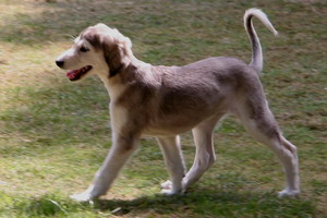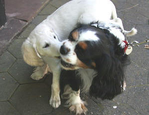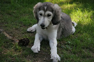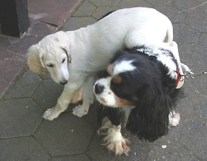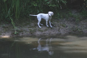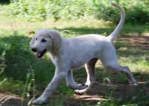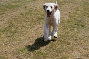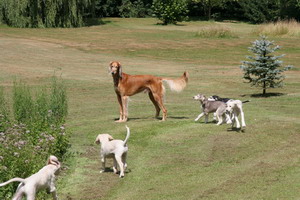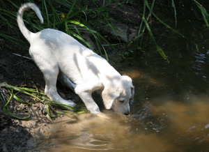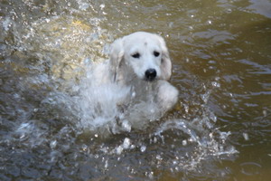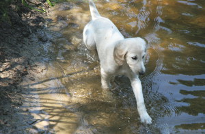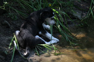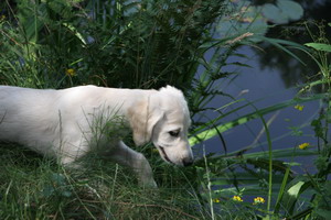 Auf diesen Fotos sind unsere Welpen 8 Wochen alt.Sie bekommen jetzt netten Hundebesuch, um sich an andere Rassen zu gewöhnen.Unter Aufsicht können sie jetzt auch im großen Grundstück herumtoben. Unser Teich fasziniert sie dabei am meisten.