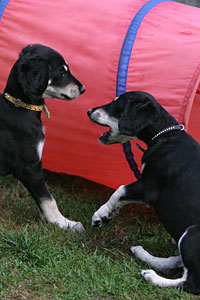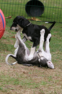 Auf diesen Fotos sind unsere Welpen 7 Wochen alt. Sie werden nun immer selbständiger und erkunden alles. Unter Aufsicht dürfen sie auch zusammen mit unseren erwachsenen Salukis, siehe Fotos unten, in unserem gesamten Garten [10.000qm] mit Teich spielen.