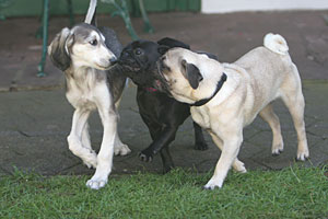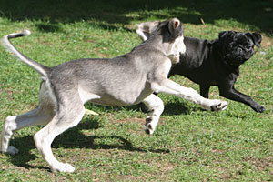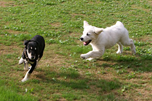 Auf diesen Fotos sind unsere Welpen 9 Wochen alt. Die Welpen bekommen in diesen Tagen Besuch von anderen Hunden. Dadurch lernen sie andere Arten der Kommunikation unter Hunden kennen.