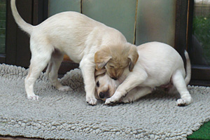 Die Welpen können nun, wie es ihnen beliebt, auch in den Welpenauslauf nach draussen laufen. Bei schönem Wetter sind sie dort gerne auf Entdeckungstour.