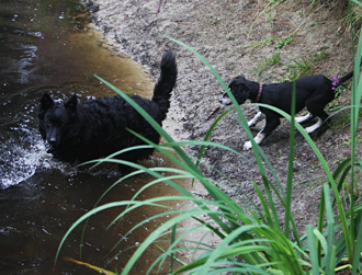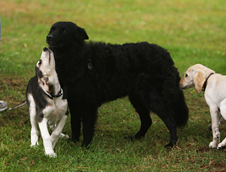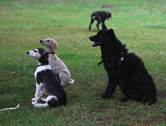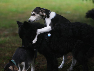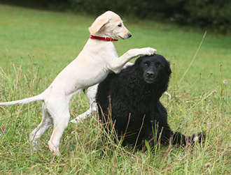 Mudi-Hündin Elli ist wieder zu Besuch und zeigt den Welpen, wie man Frisby spielt. Es ist wichtig, dass die Welpen schon früh Spiele kennenlernen, die dann auch der spätere Besitzer mit ihnen spielen kann. Es stärkt später sehr die Mensch-Saluki-Beziehung.