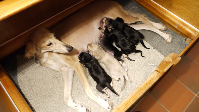 2 grizzle Hündinnen, 2 black&tan Hündinnen und 1 sandfarbener Rüde