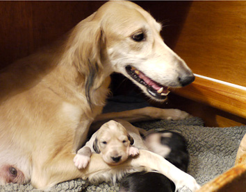 Manaya in der Wurfkiste mit ihrem Sohn "auf dem Arm"