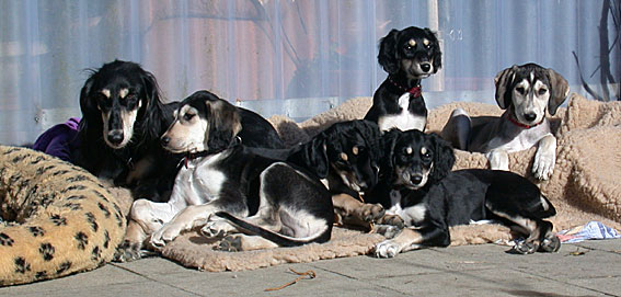 Multi-CH Tashari Sawahin mit ihrem Wurf von links nach rechts: Tashari | Name | Wohnort | | Zharat, (grizzle Rüde) | Nähe Brüssel, Belgien | | Zephanjah, (black&tan Kurzhaar-Rüde) | Esens, Nähe Nordsee | | Zephira, hinten sitzend, (bl&t Hündin) | Nizza, Frankreich | | Zhiva, liegend, (bl&t Hündin) | Sonthofen | | Zando-Khan, (grizzle Kurzhaar-Rüde) | Cuxhaven |